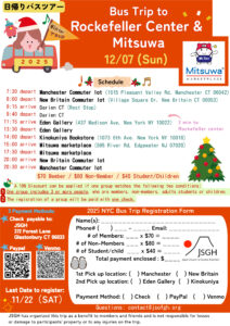 On Sunday December 7th, we will be going on our annual New York City bus trip! Come join us for a day as we explore central Manhattan for the Christmas Season as we visit the Rockefeller Center, Uniqlo, Saks Fifth Avenue, Kinokuniya bookstore, and more! Afterwards, we’ll take a trip through the Lincoln tunnel and visit Mitsuwa! $70 Members.  $80 Non-Members.  $40 Student/Children. Last Day to register for the trip is Saturday November 22nd.