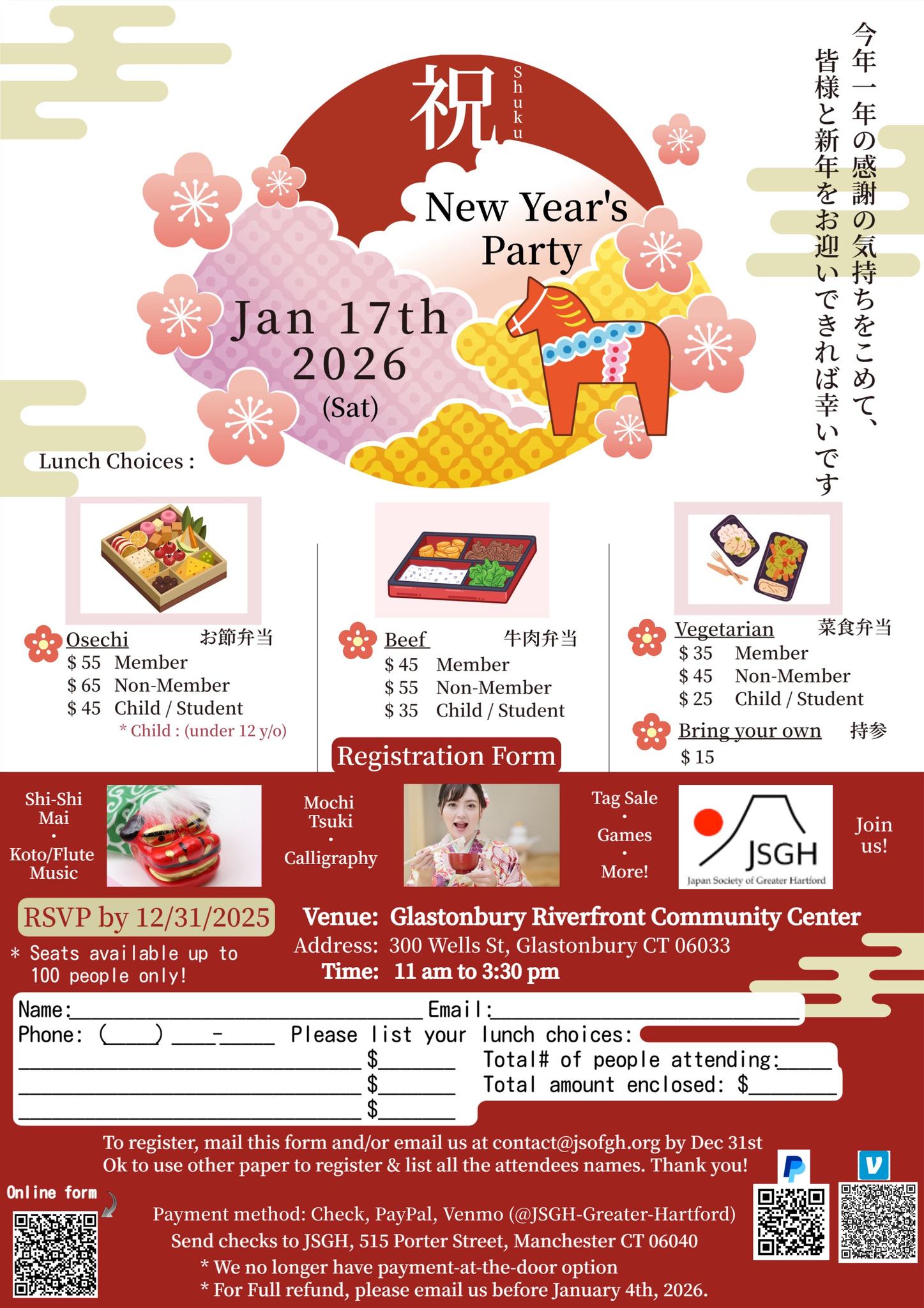Next year on January 17th, Japan Society of Greater Hartford will once again be hosting our New Year’s Party at the Glastonbury Riverfront Community Center! Come join us for a day as we discuss our plans and events for 2026, enjoy lunch, and celebrate with music, dance, games, and more!